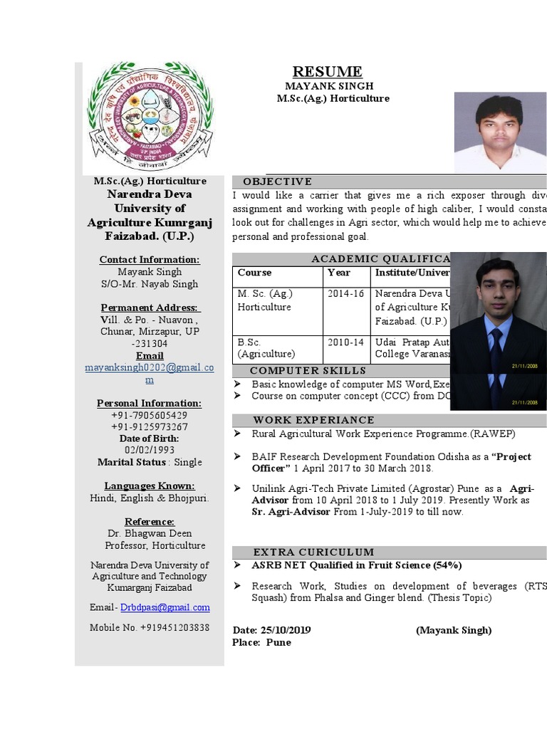 Resume Narendra Deva University Of Agriculture Kumrganj Faizabad U P Science Learning Agricultural Mechanization In Asia Africa And Latin America