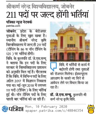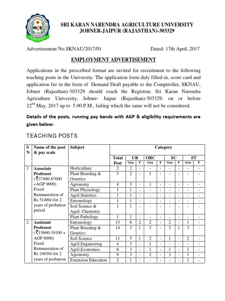 Skn agriculture university jobner jaipur. Sri karan narendra agriculture university jobner jaipur was established in september 2013 by govt of rajasthan under agriculture university jobner act 20 of 2013 and name amendment act 23 of 2013 with a view to impart teaching at the university or college level conduct research and extension education programmes in. Sri karan narendra agriculture university sknau recruitment 2020 govt jobs for guest faculty in.