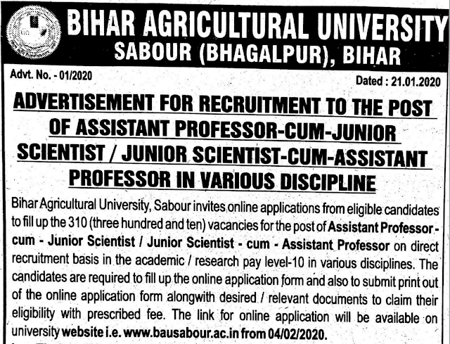 Recruitment Of Assistant Professor Cum Jr Scientist At Bihar Agriculture University Sabour 310 Vacancy Last Date 19 03 2020 Agriculture Definition Us History