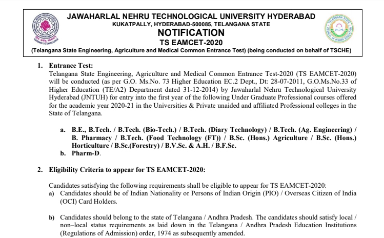Ts eamcet notification 2020 details. Ts eamcet 2020 you can check out telangana state eamcet exam 2020 complete information ie. The telangana state engineering agriculture medical pharmacy veterinary etc common entrance test 2020 ts eamcet 2020 is being conducted by jawaharlal nehru technological university hyderabad on behalf of telangana state council of higher education tsche.