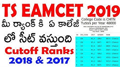 Here is a cut off list of few colleges who participated in the ts eamcet examination 2018. Check telangana eamcet rank estimator and rank calculator for engineering medical and agriculture courses. Whats the cut off marks of eamcet fr the caste bc e i got 43 marks in eamcet nd 974 in ipe.